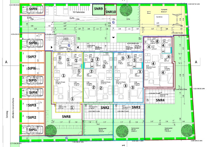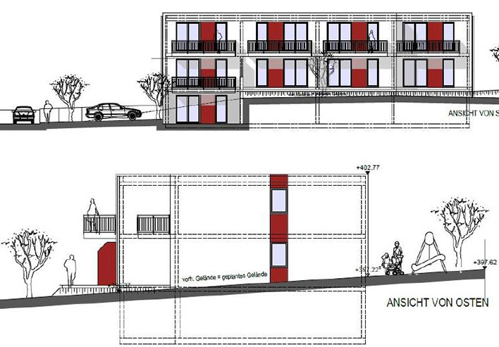 Projektiert ist eine kleine Wohnanlage mit 8 Wohnungen mit je ca. 60 qm. Zu jeder Wohnung gehört ein PKW-Stellplatz, der separat verkauft wird. Wir bieten Ihnen aktuell 2 Wohnungen im Erdgeschoss und 2 Wohnungen im ersten Stock sowie eine Wohnung im Untergeschoss an (die anderen Wohneinheiten sind bereits vergriffen). Aus ökologischen und wohnlichen Überlegungen heraus haben wir uns für stabile Massivbauweise entschieden. Im WU-Beton-Keller steht jeder Wohnung ein eigener Abstellraum zur Verfügung, Waschmaschinenraum und Technik.