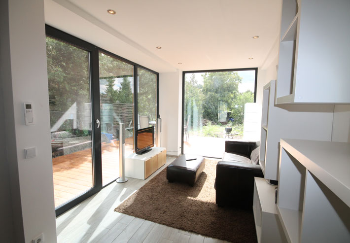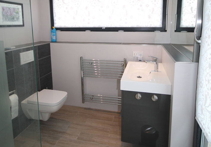 Eine gemeinschaftliche Grünfläche, die zum Grillen oder für Bewegung genutzt werden kann, möge die gute Nachbarschaft fördern. Natürlich haben die ebenerdigen Wohnungen einen kleinen Garten, und die oberen Einheiten je einen Balkon. Zentral-Heizung und Warmwasser werden über die modernste Wärmepumpe zur Fußbodenheizung geliefert. Jede Wohnung hat ein ansprechendes Bad mit WC, großer Dusche und elegantem Waschtisch.